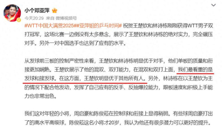 而最有劲的相沿来自乒乓球名宿邓亚萍,她在酬酢媒体上对王楚钦的发球和接发球本领给出了超高评价,特出歌颂他在混双和双打中的阐明:“咱们最垂青的是发球和接发球,在这方面,王楚钦清晰优于其他系数东谈主!”这一评价无疑是对证疑声的最有劲挣扎;邓亚萍对王楚钦真实定不单是局限于发球本领,她对王楚钦的背负感和担当精神有目共赏,觉得这是他不详饱经风雨,最终登顶的重要要素
