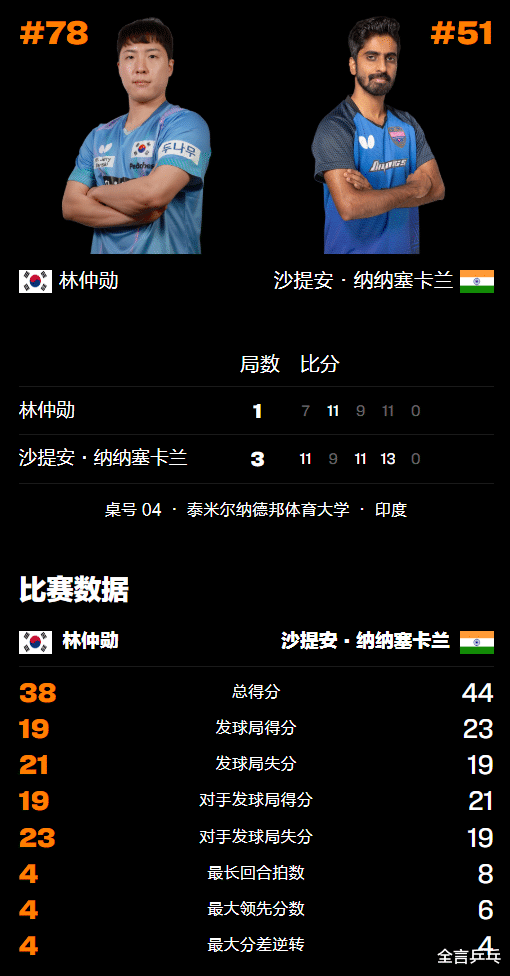 加纳纳塞卡兰是现在印度男乒的一哥,早年曾有过打败王楚钦、张本智和的高光工夫,但后继乏力,不外林钟勋最近的单打景色也不睬念念,是以二东谈主谁能胜出存在悬念。